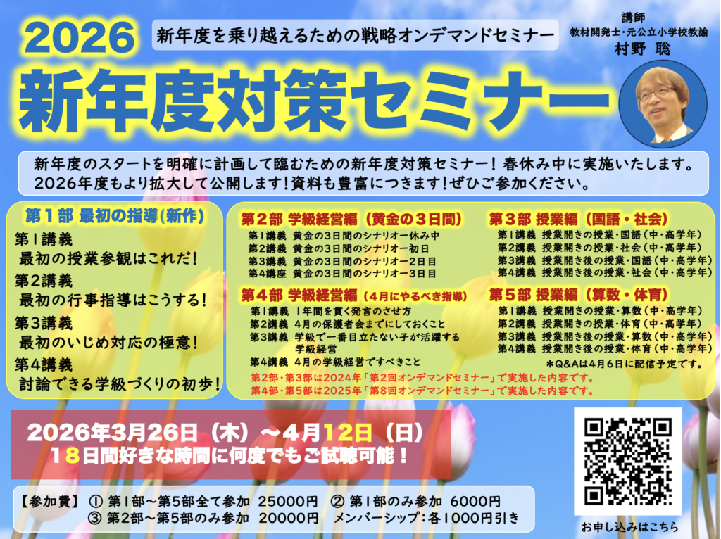 ごあいさつ この度、34年間の小学校教員生活を早期に終えました。これまでインプットしてきた教育情報をアウトプットするためです。このサイトを中心に教育情報を発信してまいります。よろしくお願いいたします。 教材開発SHOPのホームページをリニューアルしました!(タイトルをクリック!) 「2026新年度対策セミナー」3月26日〜4月12日まで開催!(1週間伸びました!) (詳細は画面をクリック↓)
